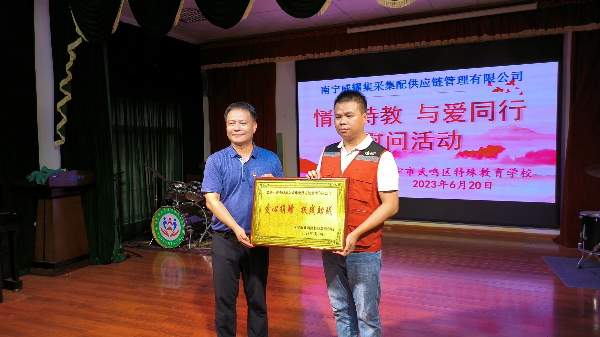 ?6月20日,武鳴區(qū)教育局聯(lián)合威皓供應鏈集團下屬監(jiān)管單位威耀供應鏈公司邕北分公司前往武鳴區(qū)特殊教育學校開展“情系特教 與愛同行”慰問活動。武鳴區(qū)教育局體衛(wèi)藝股股長謝國明,威耀供應鏈公司邕北分公司副總經(jīng)理黎世喜參加了慰問活動?;顒忧?,謝國明前往學校展覽廳參觀學生作品和詳細了解特殊教育學校發(fā)展歷程、師資配備、特色教學等情況?;顒蝇F(xiàn)場,威耀供應鏈公司邕北分公司為特教孩子們分發(fā)粽子、冰淇淋等慰問品,并與孩...