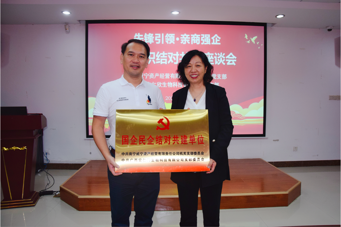 威寧資產(chǎn)公司黨委書記、董事長譚全強向安仁欣公司贈送結(jié)隊共建牌匾威寧資產(chǎn)公司機關(guān)支部黨員參觀安仁欣公司實驗室2020年10月28日下午,南寧威寧資產(chǎn)經(jīng)營有限責(zé)任公司與廣西安仁欣生物科技有限公司舉行了“先鋒引領(lǐng)·親商強企”黨組織結(jié)對共建簽約儀式。兩家單位的負責(zé)人現(xiàn)場簽署了《黨組織結(jié)隊共建意向書》,互贈共建牌匾,承諾組織共建、先鋒共創(chuàng)、資源共享、發(fā)展共謀,努力實現(xiàn)黨建、業(yè)務(wù)“雙促進”。威寧資產(chǎn)公司還向安
