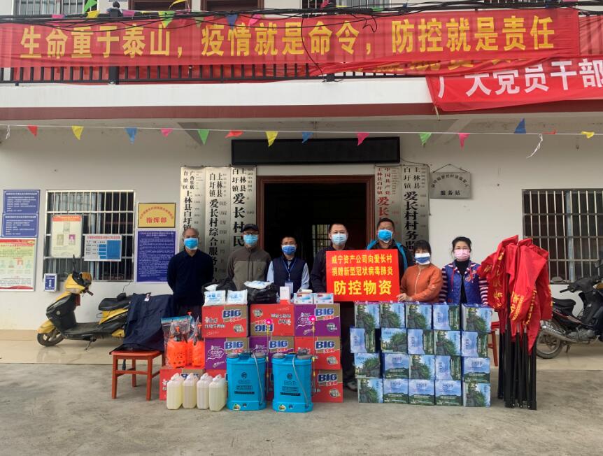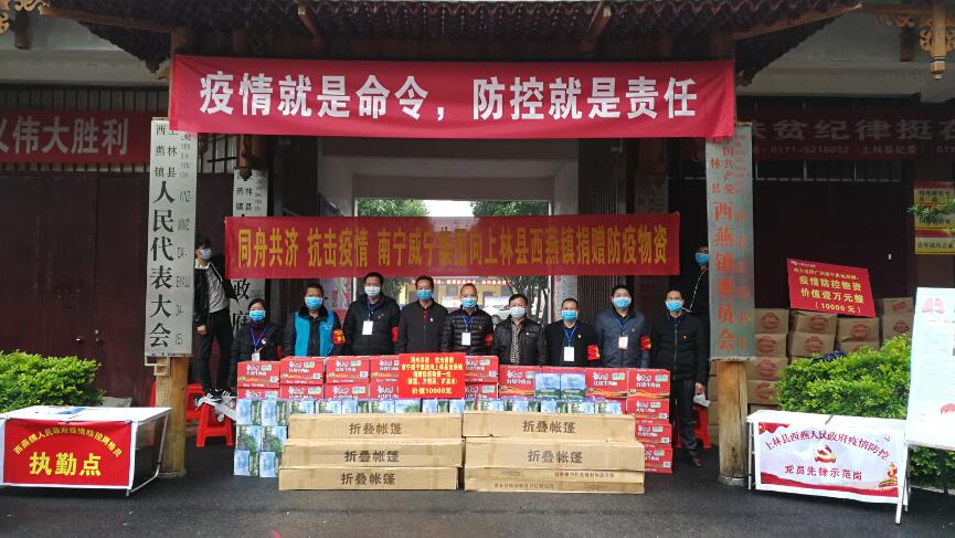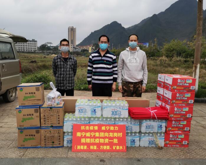 2020年2月12日,細(xì)雨不斷,大霧蒙蒙,一輛滿載著防疫物資的貨車停在了上林縣西燕鎮(zhèn)人民政府,南寧威寧集團(tuán)黨委副書記馬超毅與后盾單位威寧房地產(chǎn)公司、威寧市場(chǎng)公司將價(jià)值1萬(wàn)元的帳篷、方便面、礦泉水等防疫物資送到了西燕鎮(zhèn)黨委書記韋伯永手中,援助扶貧村抗擊疫情。