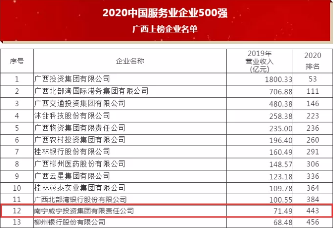 2020年9月28日,中國(guó)企業(yè)聯(lián)合會(huì)、中國(guó)企業(yè)家協(xié)會(huì)發(fā)布了“2020中國(guó)服務(wù)業(yè)企業(yè)500強(qiáng)”榜單,廣西共有13家企業(yè)入圍。南寧威寧集團(tuán)成為唯一一家連續(xù)五年入圍中國(guó)服務(wù)業(yè)企業(yè)500強(qiáng)的南寧市屬國(guó)有企業(yè)。
