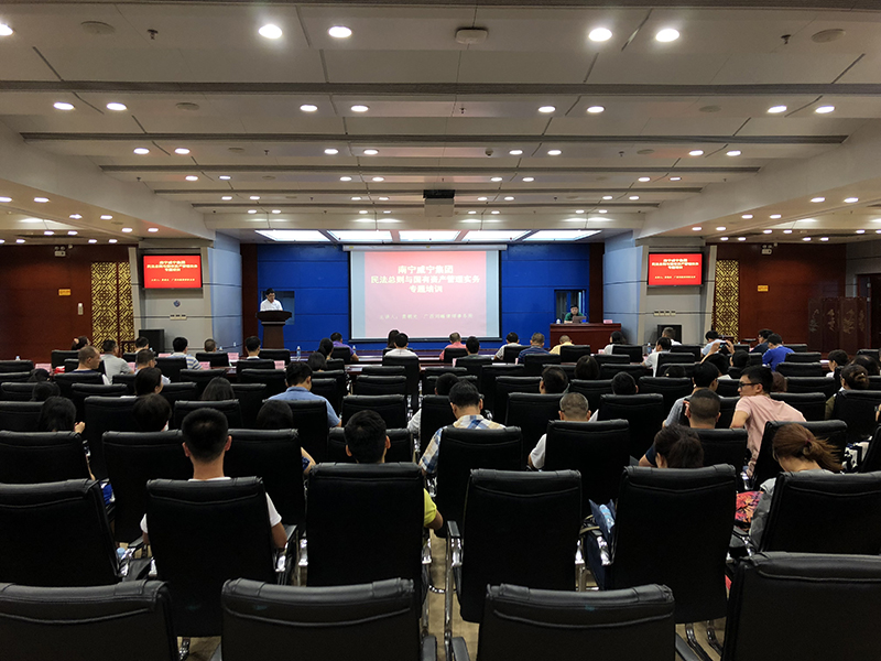 2018年5月31日,南寧威寧集團(tuán)舉辦民法總則與國有資產(chǎn)管理實(shí)務(wù)專題培訓(xùn)班,特邀集團(tuán)公司常年法律顧問廣西劉晰律師事務(wù)所龔朝光律師主講,集團(tuán)公司副總經(jīng)理劉熾雄、集團(tuán)本部各部門員工、各監(jiān)管單位法律事務(wù)分管領(lǐng)導(dǎo)、部門負(fù)責(zé)人、法務(wù)專員及相關(guān)業(yè)務(wù)人員等120余人參加了培訓(xùn)。